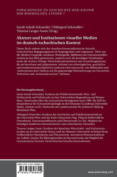 Sarah Scholl-Schneider, Studium der Politikwissenschaft, West- und Südslawistik und Volkskunde an den Universitäten Regensburg und Brünn/ Brno. Dissertation über die tschechische Remigration nach 1989. Bis 2020 Juniorprofessur für Kulturanthropologie an der Johannes Gutenberg-Universität Mainz, seitdem stellv. Direktorin der Landeszentrale für politische Bildung Rheinland-Pfalz. Hildegard Schmoller, Studium der Geschichte und Politikwissenschaft an der Universität Wien und der Karls-Universität Prag. Tätig als freiberufliche Historikerin, Dokumentarfilmerin und Übersetzerin (cz-de). Mitglied der Ständigen Konferenz österreichischer und tschechischer Historiker zum gemeinsamen kulturellen Erbe. Theresa Langer-Asam, Studium der Sprachen, Wirtschafts- und Kulturraumstudien an der Universität Passau und der Masaryk-Universität in Brünn/Brno. Freiberufliche Historikerin und Übersetzerin. Assoziierte Wissenschaftlerin am Leibniz-Institut für Bildungsmedien in Braunschweig und Mitglied der Gemeinsamen Deutsch-Tschechischen Schulbuchkommission.