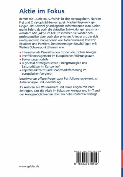 Bereits mit "Aktie im Aufwind" ist den Herausgebern, Norbert Frei und Christoph Schlienkamp, ein Nachschlagewerk gelungen, das sowohl grundlegende Informationen zum Aktienmarkt liefert als auch die aktuellen Entwicklungen praxisnah erläutert. Mit "Aktie im Fokus" sprechen sie wieder den professionellen aber auch den privaten Anleger an, der sich umfassend mit Innovationen wie Aktienrückkauf, Investor Relations und Pensions-Sondervermögen beschäftigen will. Weitere Schwerpunktthemen wie