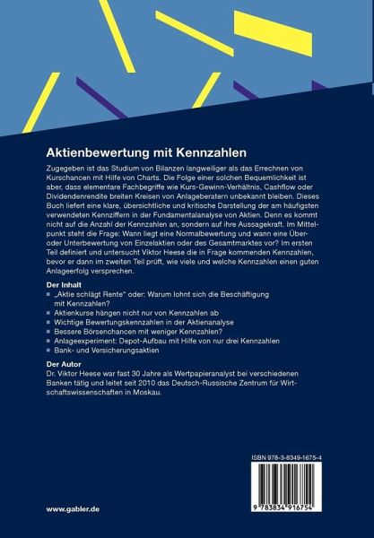 Zugegeben ist das Studium von Bilanzen langweiliger als das Errechnen von Kurschancen mit Hilfe von Charts. Die Folge einer solchen Bequemlichkeit ist aber, dass elementare Fachbegriffe wie Kurs-Gewinn-Verhältnis, Cashflow oder Dividendenrendite breiten Kreisen von Anlageberatern unbekannt bleiben. Dieses Buch liefert eine klare, übersichtliche und kritische Darstellung der am häufigsten verwendeten Kennziffern in der Fundamentalanalyse von Aktien. Denn es kommt nicht auf die Anzahl der Kennzahlen an, sondern auf ihre Aussagekraft. Im Mittelpunkt steht die Frage: Wann liegt eine Normalbewertung und wann eine Über- oder Unterbewertung von Einzelaktien oder des Gesamtmarktes vor? Im ersten Teil definiert und untersucht Viktor Heese die in Frage kommenden Kennzahlen, bevor er dann im zweiten Teil prüft, wie viele und welche Kennzahlen einen guten Anlageerfolg versprechen.