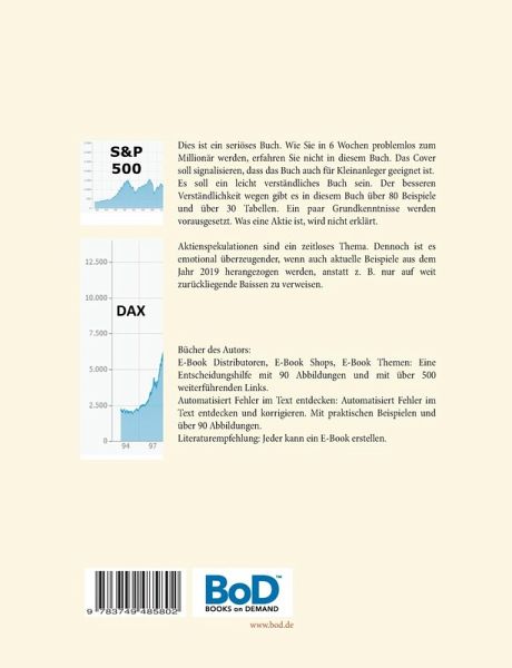 Fakten! Fakten! Mit Verweisen auf zahlreiche Studien. Dies ist ein seriöses Buch. Das Cover soll signalisieren, dass das Buch auch für Kleinanleger geeignet ist.Es soll ein leicht verständliches Buch sein. Der besseren Verständlichkeit wegen gibt es in diesem Buch über 80 Beispiele und über 30 Tabellen. Ein paar Grundkenntnisse werden vorausgesetzt. Was eine Aktie ist, wird nicht erklärt.Aktienspekulationen sind ein zeitloses Thema. Dennoch ist es emotional überzeugender, wenn auch aktuelle Beispiele aus dem Jahr 2019 herangezogen werden, anstatt z. B. nur auf weit zurückliegende Baissen zu verweisen. Neben dem DAX und dem MDAX werden natürlich auch insbesondere die US-amerikanischen Börsenindices betrachtet. Denn wer nur in heimischen Gewässern angelt, wird die dicken Fische nicht an Land ziehen. Und macht sich von dem exportlastigen Unternehmen im DAX abhängig. Das in Zeiten, in denen Handelskriege angeblich leicht und einfach zu gewinnen seien.Die psychische Belastung bei Börsenkorrekturen und Baissen ist auf jeden Fall größer, als wenn die Börsenkurse generell steigen. Daher sind Börsenkorrekturen und Baissen eine der Schwerpunkte in diesem Buch. Um weitere Schwerpunkte dieses Buches sofort erkennen zu können, biete ich hier einen groben Leitfaden für das Buch an.Auch weil das Inhaltsverzeichnis mit über 140 Überschriften sehr feingliedrig ist, gibt es an dieser Stelle einen groben Leitfaden für das Buch.Das Buch besteht aus 10 Teilen, die unterschiedlich groß sind.Teil 1: Niemand kann vorhersehen, wie sich Aktienkurse kurzfristig entwickelnTeil 2: Börsenweisheiten und BörsenregelnTeil 3: Indikatoren für Rezessionen und BaissenTeil 4: BörsenkorrekturenTeil 5: Zeitdauer von Börsenkorrekturen, Baissen und KurserholungenTeil 6: ETFsTeil 7: Sehr erfolgreiche SpekulantenTeil 8: Warum auf Dauer der Wert von bekannten Börsenindices steigtTeil 9: Unternehmensanleihen, Immobilien, Gold besser als Aktien?Teil 10: Zu riskante GeldanlagenDie Bezeichnungen der Teile sind nicht in allen Fällen deckungsgleich mit den Überschriften im Inhaltsverzeichnis. Es ist schließlich ein grober Leitfaden.In dem Buch werden Zusammenhänge erklärt. Es wird aufgezeigt, dass man grundsätzlich die Unsicherheiten der Aktienmärkte psychisch in den Griff bekommen kann.Das Buch beinhaltet Begründungen, warum die Risiken bei Aktienspekulationen überschaubar sind.