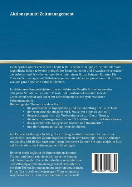 Kindergartenkinder vereinbaren heute feste Termine zum Spielen, Schulkinder und Jugendliche haben teilweise prallgefüllte Terminkalender und Erwachsene versuchen das Arbeits- und Privatleben irgendwie unter einen Hut zu bringen. Kurzum: Die Themen Zeitmanagement und Arbeitsorganisation sind für viele von uns ganz heiße und aktuelle Themen.In 16 heiteren Kurzgeschichten der schwäbischen Familie Schneider werden alltägliche Situationen aus dem Privat- und Berufsumfeld erzählt. Jede der Geschichten befasst sich dabei mit Kernelementen eines systematischen Zeitmanagements. Hier einige der Themen aus dem Buch: _ die professionelle Tagesplanung und die Einbettung der To-Do Liste, _ der professionelle Umgang mit E-Mails (mit Tipps zu Outlook), _ Besprechungen - von der Vorbereitung bis zur Durchführung,_ die Arbeitsplatzorganisation - vom Schreibtisch bis zum Aktenschrank,_ das systematische Ablegen von Dateien und Dokumenten _ und der Umgang mit alltäglichen Zeitdieben.Am Ende jeder Kurzgeschichte gibt es Hintergrundinformationen zu den in der Geschichte enthaltenen Zeitmanagementthemen. 59 Praxistipps und 4 Checklisten runden das Bild ab. Das Fazit einer jeden Geschichte können Sie dann gleich im Buch auf Ihr persönliches Zeitmanagement übertragen.
