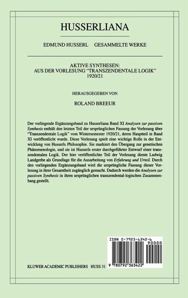 Der vorliegende Ergänzungsband zu Husserliana Band XI Analysen zur passiven Synthesis enthält den letzten Teil der ursprünglichen Fassung der Vorlesung über `Transzendentale Logik' vom Wintersemester 1920/21, deren Hauptteil in Band XI veröffentlicht wurde. Diese Vorlesung spielt eine wichtige Rolle in der Entwicklung von Husserls Philosophie. Sie markiert den Übergang zur genetischen Phänomenologie, und sie ist Husserls erster durchgeführter Entwurf einer transzendentalen Logik. Der hier veröffentlichte Teil der Vorlesung diente Ludwig Landgrebe als Grundlage für die Ausarbeitung von Erfahrung und Urteil. Durch den vorliegenden Ergänzungsband wird die ursprüngliche Fassung dieser Vorlesung in ihrer Gesamtheit zugänglich gemacht. Dadurch werden die Analysen zur passiven Synthesis in ihren ursprünglichen transzendental-logischen Zusammenhang gestellt.