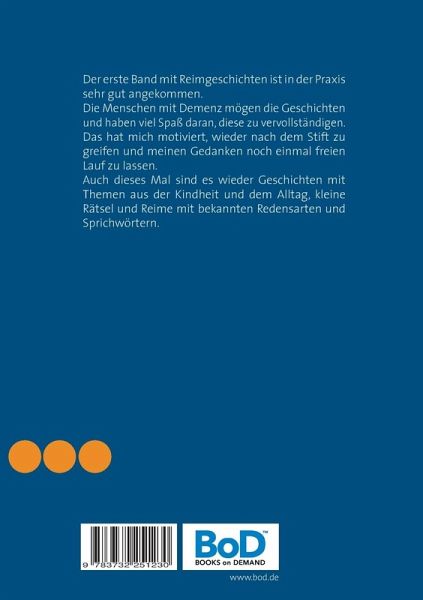 Der erste Band mit Reimgeschichten ist in der Praxis sehr gut angekommen.Die Menschen mit Demenz mögen die Geschichten und haben viel Spaß daran, diese zu vervollständigen.Das hat mich motiviert, wieder nach dem Stift zu greifen und meinen Gedanken noch einmal freien Lauf zu lassen.Auch dieses Mal sind es wieder Geschichten aus der Kindheit und dem Alltag, kleine Rätsel und Reime mit bekannten Redensarten und Sprichwörtern.