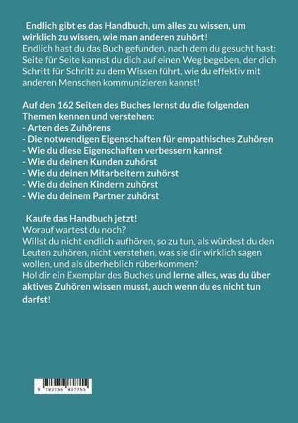 Endlich gibt es das Handbuch, um alles zu wissen, um wirklich zu wissen, wie man anderen zuhört!Endlich hast du das Buch gefunden, nach dem du gesucht hast: Seite für Seite kannst du dich auf einen Weg begeben, der dich Schritt für Schritt zu dem Wissen führt, wie du effektiv mit anderen Menschen kommunizieren kannst!Auf den 162 Seiten des Buches lernst du die folgenden Themen kennen und verstehen:- Arten des Zuhörens- Die notwendigen Eigenschaften für empathisches Zuhören- Wie du diese Eigenschaften verbessern kannst- Wie du deinen Kunden zuhörst- Wie du deinen Mitarbeitern zuhörst- Wie du deinen Kindern zuhörst- Wie du deinem Partner zuhörstKaufe das Handbuch jetzt!Worauf wartest du noch?Willst du nicht endlich aufhören, so zu tun, als würdest du den Leuten zuhören, nicht verstehen, was sie dir wirklich sagen wollen, und als überheblich rüberkommen?Hol dir ein Exemplar des Buches und lerne alles, was du über aktives Zuhören wissen musst, auch wenn du es nicht tun darfst!