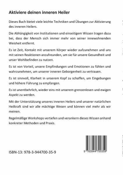 Dieses Buch bietet viele leichte Techniken und Übungen zur Aktivierung des inneren Heilers. Die Abhängigkeit von Institutionen und einseitigem Wissen tragen dazu bei, dass der Mensch sich immer mehr von seiner innewohnenden Weisheit entfernt. Es ist Zeit, Kontakt mit unserem Körper wieder aufzunehmen und uns mit seinen Reaktionen anzufreunden, um sie für unsere Gesundheit und unser Wohlbefinden zu nutzen. Es ist von Vorteil, unsere Empfindungen und Emotionen zu fühlen und wahrzunehmen, um unserer inneren Geborgenheit zu vertrauen. Es ist sinnvoll, Klarheit in unserem Kopf zu schaffen, um Eingebungen und höhere Führung zu empfangen. Es ist unentbehrlich, wieder eins mit unserem grenzenlosen und ewigen Aspekt zu werden. Mit der Unterstützung unseres inneren Heilers und unserer natürlichen Heilkraft sind wir alle mächtige Wesen und können viel mehr als wir meinen. Regelmäßige Workshops vertiefen und verankern dieses Wissen anhand konkreter Methoden und Praxis.