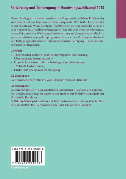 Dieses Buch geht in seiner Analyse der Frage nach, welchen Einfluss der Wahlkampf auf das Ergebnis der Bundestagswahl 2013 hatte. Dazu wendet es auf eklektische Weise etablierte Wahltheorien an und verbindet diese mit dem Konzept des "Wahlkampfereignisses". Um die Wählerentscheidungen zu jedem Zeitpunkt des Wahlkampfs nachzeichnen zu können werden die Prognosemarktdaten von politikprognosen.de sowie ein Umfragedurchschnitt der Befragungsunternehmen mit wöchentlicher Befragung (Forsa, Emnid, Infratest) herangezogen.