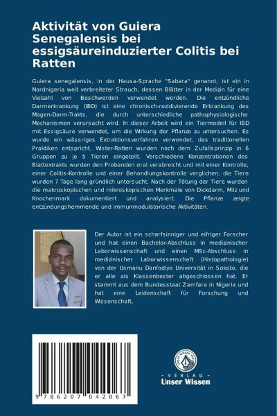 Guiera senegalensis, in der Hausa-Sprache "Sabara" genannt, ist ein in Nordnigeria weit verbreiteter Strauch, dessen Blätter in der Medizin für eine Vielzahl von Beschwerden verwendet werden. Die entzündliche Darmerkrankung (IBD) ist eine chronisch-rezidivierende Erkrankung des Magen-Darm-Trakts, die durch unterschiedliche pathophysiologische Mechanismen verursacht wird. In dieser Arbeit wird ein Tiermodell für IBD mit Essigsäure verwendet, um die Wirkung der Pflanze zu untersuchen. Es wurde ein wässriges Extraktionsverfahren verwendet, das traditionellen Praktiken entspricht. Wister-Ratten wurden nach dem Zufallsprinzip in 6 Gruppen zu je 5 Tieren eingeteilt. Verschiedene Konzentrationen des Blattextrakts wurden den Probanden oral verabreicht und mit einer Kontrolle, einer Colitis-Kontrolle und einer Behandlungskontrolle verglichen; die Tiere wurden 7 Tage lang gründlich untersucht. Nach der Tötung der Tiere wurden die makroskopischen und mikroskopischen Merkmale von Dickdarm, Milz und Knochenmark dokumentiert und analysiert. Die Pflanze zeigte entzündungshemmende und immunmodulatorische Aktivitäten.