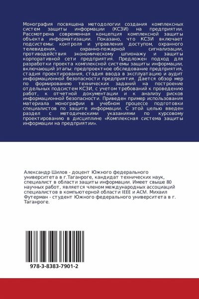 Monografiq poswqschena metodologii sozdaniq komplexnyh sistem zaschity informacii (KSZI) na predpriqtii. Rassmotrena sowremennaq koncepciq komplexnoj zaschity ob#ekta informatizacii. Pokazano, chto KSZI wklüchaet podsistemy: kontrolq i uprawleniq dostupom, ohrannogo telewideniq, ohranno-pozharnoj signalizacii, protiwodejstwiq äkonomicheskomu shpionazhu i zaschity korporatiwnoj seti predpriqtiq. Predlozhen podhod dlq razrabotki proekta komplexnoj sistemy zaschity informacii, wklüchaüschij ätapy: predproektnoe obsledowanie predpriqtiq, stadiq proektirowaniq, stadiq wwoda w äxpluataciü i audit informacionnoj bezopasnosti predpriqtiq. Daetsq obzor mer po formirowaniü tehnicheskih zadanij na postroenie otdel'nyh podsistem KSZI, s uchetom trebowanij k prowedeniü rabot, k otchetnoj dokumentacii i k analizu riskow informacionnoj bezopasnosti. Priweden primer ispol'zowaniq materiala monografii w uchebnom processe podgotowki specialistow po zaschite informacii. S ätoj cel'ü wweden razdel s metodicheskimi ukazaniqmi po kursowomu proektirowaniü w discipline «Komplexnaq sistema zaschity informacii na predpriqtii».