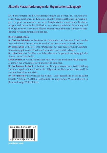 Einleitung - aktuelle Herausforderungen der Organisationspädagogik.- Schule ohne Rassismus? Migrationspädagogische und organisationspädagogische Perspektiven auf die (De-)Thematisierung von Rassismus in der Schule.- Das Integrationsimperativ der ko_operativen Bildungslandschaft. Eine (rassismus)kritische Reflexion.- Institutionelle Handlungslogiken pädagogischer Praxis am Beispiel außerschulischer Bildungsangebote.- Sportvereine als Orte der Integration von Migrant*innen und Geflüchteten? Erkundungen aus einer Social-World-Perspektive.- In Blickordnungen intervenieren? Das Gütesiegel 'Interkulturelle Vielfalt LEBEN' als performatives Artefakt und epistemisches Grenzobjekt kollektiver Strategieentwicklung.- Organisationales Lernen unter den Bedingungen von Dezentralität und Asynchronität. Eine Betrachtung klassischer Theorien organisationalen Lernens aus praxeologischer Perspektive.- Die (Selbst-)Bildung der Organisation. Organisationspädagogische Überlegungen aus subjektivierungstheoretischer Perspektive.- Transformationsprozesse in organisationspädagogischer Wissenschaftspraxis.- Demokratielernen am Arbeitsplatz demokratisch verfasster Organisationen. Theoretische Überlegungen zur Erforschung des Lernens von Organisationsmitgliedern.- Zeit als analytische Kategorie der Organisationspädagogik: Die Organisation subjektiver Zeiterfahrung und ihre digitale Transformation.- "Es steppte der Bär durch leere Flure" - Selbstbeschreibungen organisationaler Lernprozesse der Volkshochschulen in Zeiten von Corona.- Organisationsentwicklung im Wandel - neue Konzepte angesichts hoher Dynamik und Komplexität.