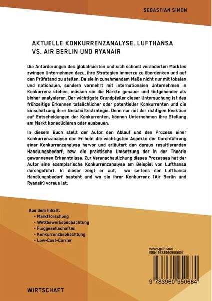 Die Anforderungen des globalisierten und sich schnell veränderten Marktes zwingen Unternehmen dazu, ihre Strategien immerzu zu überdenken und auf den Prüfstand zu stellen. Da sie in zunehmendem Maße nicht nur mit lokalen und nationalen, sondern vermehrt mit internationalen Unternehmen in Konkurrenz stehen, müssen sie die Märkte genauer und tiefgehender als bisher analysieren. Der wichtigste Grundpfeiler dieser Untersuchung ist das frühzeitige Erkennen tatsächlicher oder potentieller Konkurrenten und die Einschätzung ihrer Geschäftsstrategie. Denn nur mit der richtigen Reaktion auf Entscheidungen der Konkurrenten, können Unternehmen ihre Stellung am Markt konsolidieren oder ausbauen.In diesem Buch stellt der Autor den Ablauf und den Prozess einer Konkurrenzanalyse dar. Er hebt die wichtigsten Aspekte der Durchführung einer Konkurrenzanalyse hervor und erläutert den daraus resultierenden Handlungsbedarf, bzw. die praktische Umsetzung der in der Theorie gewonnenen Erkenntnisse. Zur Veranschaulichung dieses Prozesses hat der Autor eine exemplarische Konkurrenzanalyse am Beispiel von Lufthansa durchgeführt. In dieser zeigt er auf, wo seitens der Lufthansa Handlungsbedarf besteht und wo sie ihrer Konkurrenz (Air Berlin und Ryanair) voraus ist.Aus dem Inhalt:- Marktforschung;- Wettbewerbsbeobachtung;- Fluggesellschaften;- Konkurrenzbeobachtung;- Low-Cost-Carrier