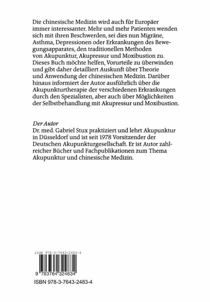 Stellenwert der Akupunktur Die chinesische Heilkunde auf dem Weg zum anerkannten Heilverfahren.- Philosophische Hintergründe und Theorien der chinesischen Medizin.- Organe, Meridiane und Akupunkturpunkte.- Diagnostik in der traditionellen chinesischen Medizin.- Wirkungsweise und wissenschaftliche Erklärung der Akupunktur.- Akupunkturtherapie.- Akupressur.- Moxibustion.- Qi Gong, chinesische Atem- und Meditationstherapie.