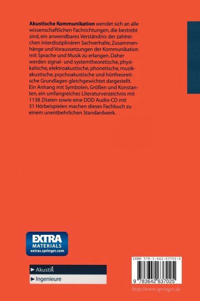 Akustische Kommunikation wendet sich an alle wissenschaftlichen Fachrichtungen, die bestrebt sind, ein anwendbares Verständnis der zahlreichen interdisziplinären Sachverhalte, Zusammenhänge und Voraussetzungen der Kommunikation mit Sprache und Musik zu erlangen. Daher werden signal- und systemtheoretische, physikalische, elektroakustische, phonetische, musikakustische, psychoakustische und hörtheoretische Grundlagen gleichgewichtet dargestellt. Ein Anhang mit Symbolen, Größen und Konstanten, ein umfangreiches Literaturverzeichnis mit 1123 Zitaten sowie eine CD mit 31 Hörbeispielen machen dieses Fachbuch zu einem unentbehrlichen Standardwerk.