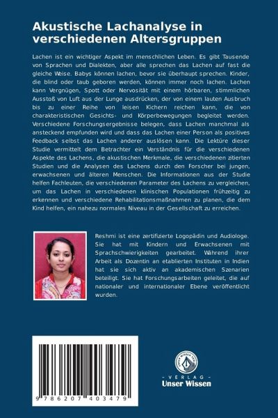 Lachen ist ein wichtiger Aspekt im menschlichen Leben. Es gibt Tausende von Sprachen und Dialekten, aber alle sprechen das Lachen auf fast die gleiche Weise. Babys können lachen, bevor sie überhaupt sprechen. Kinder, die blind oder taub geboren werden, können immer noch lachen. Lachen kann Vergnügen, Spott oder Nervosität mit einem hörbaren, stimmlichen Ausstoß von Luft aus der Lunge ausdrücken, der von einem lauten Ausbruch bis zu einer Reihe von leisen Kichern reichen kann, die von charakteristischen Gesichts- und Körperbewegungen begleitet werden. Verschiedene Forschungsergebnisse belegen, dass Lachen manchmal als ansteckend empfunden wird und dass das Lachen einer Person als positives Feedback selbst das Lachen anderer auslösen kann. Die Lektüre dieser Studie vermittelt dem Betrachter ein Verständnis für die verschiedenen Aspekte des Lachens, die akustischen Merkmale, die verschiedenen zitierten Studien und die Analysen des Lachens durch den Forscher bei jungen, erwachsenen und älteren Menschen. Die Informationen aus der Studie helfen Fachleuten, die verschiedenen Parameter des Lachens zu vergleichen, um das Lachen in verschiedenen klinischen Populationen frühzeitig zu erkennen und verschiedene Rehabilitationsmaßnahmen zu planen, die dem Kind helfen, ein nahezu normales Niveau in der Gesellschaft zu erreichen.