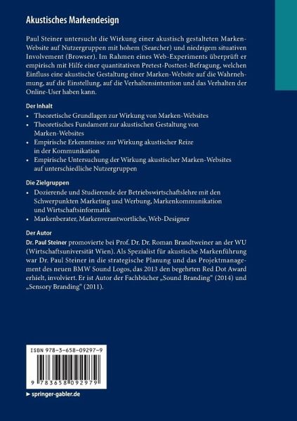 Paul Steiner untersucht die Wirkung einer akustisch gestalteten Marken-Website auf Nutzergruppen mit hohem (Searcher) und niedrigem situativen Involvement (Browser). Im Rahmen eines Web-Experiments überprüft er empirisch mit Hilfe einer quantitativen Pretest-Posttest-Befragung, welchen Einfluss eine akustische Gestaltung einer Marken-Website auf die Wahrnehmung, auf die Einstellung, auf die Verhaltensintention und das Verhalten der Online-User haben kann.