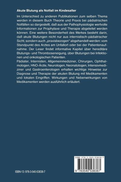Die Besonderheit dieses Buches besteht darin, dass Theorie und Praxis der Notfälle aufgezeigt werden, so dass aus der Pathophysiologie wertvolle Informationen zur Prophylaxe und Therapie gezogen werden können. Eine weitere Besonderheit dieses Buches besteht darin, dass akute Blutungen nicht nur aus internistisch-pädiatrischer Sicht dargestellt werden, sondern auch vom Standpunkt dessen, der mit diesen Notfällen am Unfallort oder in der täglichen Praxis konfrontiert wird. So findet man Kapitel über hereditäre Blutungs- und Thromboseneigung, über Blutungen bei Infektionen und onkologischen Patienten und auch wertvolle Hinweise, wie Chirurgen, Ophthalmologen, HNO-Ärzte, Neurologen, Neonatologen, Intensivmediziner und Gastroenterologen die akute Blutung mit Medikamenten und lokalen Eingriffen diagnostisch und therapeutisch angehen können. Wirkung und Nebenwirkung von Medikamenten werden ausführlich dargestellt.