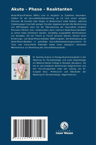 Akute-Phase-Proteine (APPs) sind im Vergleich zu Zytokinen besonders nützlich für die Gesundheitsüberwachung, da sie nach einem einzigen Stimulus 48 Stunden oder länger im Blutkreislauf stabil bleiben, während Zytokinspiegel innerhalb weniger Stunden abgebaut werden.Die Bestimmung von APP-Spiegeln kann bei der Überwachung der Gesundheit einzelner Personen hilfreich sein, insbesondere wenn mehrere Akute-Phase-Variablen zu einem Index kombiniert werden. Sorgfältig ausgewählte Kombinationen von Variablen, die von Tierart zu Tierart variieren können, können einen Ernährungs- und Akute-Phase-Indikator (NAPI) ergeben. Die Einbeziehung der Akute-Phase-Reaktion in zukünftige Gesundheitsbewertungssysteme für Tiere und menschliche Patienten bietet einen biologisch relevanten Mechanismus zur Bewertung des Gesundheitszustands.