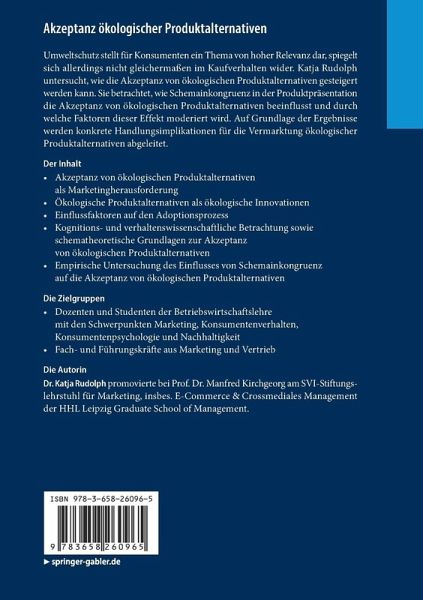 Umweltschutz stellt für Konsumenten ein Thema von hoher Relevanz dar, spiegelt sich allerdings nicht gleichermaßen im Kaufverhalten wider. Katja Rudolph untersucht, wie die Akzeptanz von ökologischen Produktalternativen gesteigert werden kann. Sie betrachtet, wie Schemainkongruenz in der Produktpräsentation die Akzeptanz von ökologischen Produktalternativen beeinflusst und durch welche Faktoren dieser Effekt moderiert wird. Auf Grundlage der Ergebnisse werden konkrete Handlungsimplikationen für die Vermarktung ökologischer Produktalternativen abgeleitet.