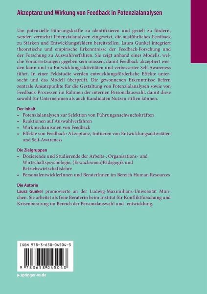 Um potenzielle Führungskräfte zu identifizieren und gezielt zu fördern, werden vermehrt Potenzialanalysen eingesetzt, die ausführliches Feedback zu Stärken und Entwicklungsfeldern bereitstellen. Laura Gunkel integriert theoretische und empirische Erkenntnisse der Feedback-Forschung und der Forschung zu Auswahlverfahren. Sie zeigt anhand eines Modells, welche Voraussetzungen gegeben sein müssen, damit Feedback akzeptiert werden kann und zu Entwicklungsaktivitäten und verbesserter Self-Awareness führt. In einer Feldstudie werden entwicklungsförderliche Effekte untersucht und das Modell überprüft. Die gewonnenen Erkenntnisse liefern zentrale Ansatzpunkte für die Gestaltung von Potenzialanalysen sowie von Feedback-Prozessen im Rahmen der internen Personalauswahl, damit diese sowohl für Unternehmen als auch Kandidaten Nutzen stiften können.