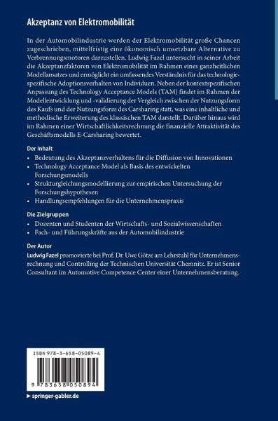 In der Automobilindustrie werden der Elektromobilität große Chancen zugeschrieben, mittelfristig eine ökonomisch umsetzbare Alternative zu Verbrennungsmotoren darzustellen. Ludwig Fazel untersuchtin seiner Arbeit die Akzeptanzfaktoren von Elektromobilität im Rahmen eines ganzheitlichen Modellansatzes und ermöglicht ein umfassendes Verständnis für das technologiespezifische Adoptionsverhalten von Individuen. Neben der kontextspezifischen Anpassung des Technology Acceptance Models (TAM) findet im Rahmen der Modellentwicklung und -validierung der Vergleich zwischen der Nutzungsformdes Kaufs und der Nutzungsform des Carsharing statt, was eine inhaltliche und methodische Erweiterung des klassischen TAM darstellt. Darüber hinaus wird im Rahmen einer Wirtschaftlichkeitsrechnung die finanzielle Attraktivität desGeschäftsmodells E-Carsharing bewertet.
