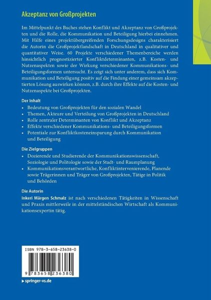 Im Mittelpunkt des Buches stehen Konflikt und Akzeptanz von Großprojekten und die Rolle, die Kommunikation und Beteiligung hierbei einnehmen. Mit Hilfe eines projektübergreifenden Forschungsdesigns charakterisiert die Autorin die Großprojektlandschaft in Deutschland in qualitativer und quantitativer Weise. 60 Projekte verschiedener Themenbereiche werden hinsichtlich prognostizierter Konfliktdeterminanten, z.B. Kosten- und Nutzenaspekten sowie der Wirkung verschiedener Kommunikations- und Beteiligungsformen untersucht. Es zeigt sich unter anderem, dass sich Kommunikation und Beteiligung positiv auf die Findung einer gemeinsam akzeptierten Lösung auswirken können, z.B. durch ihre Effekte auf die Kosten- und Nutzenaspekte bei Großprojekten.