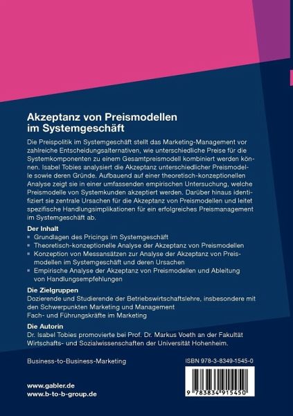 Die Preispolitik im Systemgeschäft stellt das Marketing-Management vor zahlreiche Entscheidungsalternativen, wie unterschiedliche Preise für die Systemkomponenten zu einem Gesamtpreismodell kombiniert werden können. Isabel Tobies analysiert die Akzeptanz unterschiedlicher Preismodelle sowie deren Gründe. Aufbauend auf einer theoretisch-konzeptionellen Analyse zeigt sie in einer umfassenden empirischen Untersuchung, welche Preismodelle von Systemkunden akzeptiert werden. Darüber hinaus identifiziert sie zentrale Ursachen für die Akzeptanz von Preismodellen und leitet spezifische Handlungsimplikationen für ein erfolgreiches Preismanagement im Systemgeschäft ab.