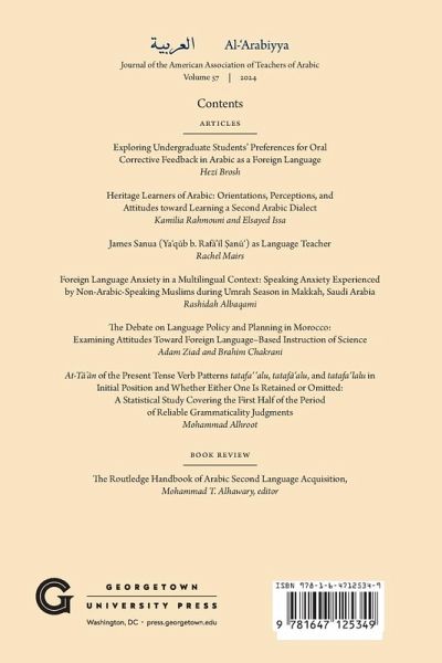 Al-'Arabiyya is the annual journal of the American Society for Teachers of Arabic. It includes scholarly articles that advance the study, research, and teaching of Arabic language, linguistics, literature, and pedagogy. The articles published in Volume 57 of Al-'Arabiyya contribute to timely topics in their own respective fields within Arabic language. This volume also includes reviews of books whose contents and scope cover a range of topics.