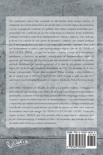 Dos sentimientos básicos han constituido la vida humana desde tiempos remotos: el sentimiento ancestral de pertenencia a un colectivo étnico y el sentir religioso de pertenencia, a la vez, a un colectivo espiritual. El equilibrio entre ambos comporta al individuo paz y prosperidad. Pero cuando uno de esos dos componentes se sobrepone al otro, el individuo comienza a recorrer la senda de los fundamentalismos étnicos y religiosos. Una senda que le llevará a la comisión de todo género de desmanes y crímenes, que siempre justificará por el amor que profesa a su credo o a su etnia, como principios supremos. Esto es lo que modernamente se conoce como fundamentalismo religioso o racial. AL CÉSAR LO QUE ES DEL CÉSAR... es una tesis novelada y expone, a través de acontecimientos apasionantes y luctuosos, un ejemplo contemporáneo de fundamentalismo étnico El practicado por miembros del clero vasco, que han sucumbido a la llamada de su tótem ancestral, sacrificando su vocación sacerdotal en el altar de esa adorada exclusividad étnica. Ello les ha llevado a apadrinar al terrorismo de ETA. Los personajes de la obra, aunque convencionales, son de plena actualidad, porque encarnan a otros verdaderos, que se resisten a dar A DIOS LO QUE ES DE DIOS. La gran acogida, que tuvo la 1ª edición de la novela, ha obligado al autor a revisarla y actualizarla. Esta es la nueva edición.
