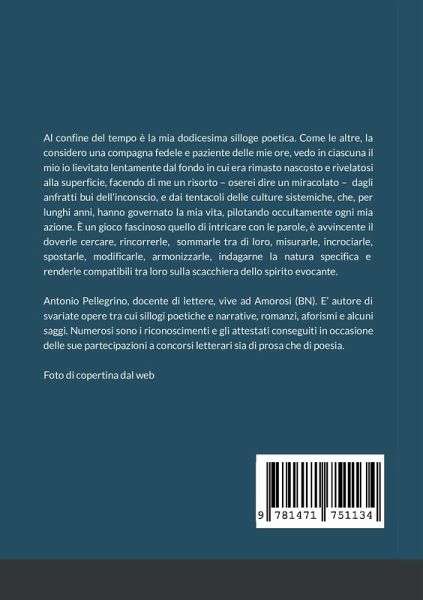 Al confine del tempo è la mia dodicesima silloge poetica. Come le altre, la considero una compagna fedele e paziente delle mie ore, vedo in ciascuna il mio io lievitato lentamente dal fondo in cui era rimasto nascosto e rivelatosi alla superficie, facendo di me un risorto - oserei dire un miracolato - dagli anfratti bui dell'inconscio, e dai tentacoli delle culture sistemiche, che, per lunghi anni, hanno governato la mia vita, pilotando occultamente ogni mia azione. È un gioco fascinoso quello di intricare con le parole, è avvincente il doverle cercare, rincorrerle, sommarle tra di loro, misurarle, incrociarle, spostarle, modificarle, armonizzarle, indagarne la natura specifica e renderle compatibili tra loro sulla scacchiera dello spirito evocante. Antonio Pellegrino, docente di lettere, vive ad Amorosi (BN). E' autore di svariate opere tra cui sillogi poetiche e narrative, romanzi, aforismi e alcuni saggi. Numerosi sono i riconoscimenti e gli attestati conseguiti in occasione delle sue partecipazioni a concorsi letterari sia di prosa che di poesia.