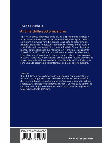 Il profeta islamico Maometto diede avvio a un programma teologico in forma teocratica. Poiché il Corano, in molti modi, si rivolge ai cristiani e agli ebrei e li invita a fare dichiarazioni, una risposta propriamente teologica è legittima e necessaria. Tenendo conto delle attuali ricerche scientifiche sull¿Islam, questo libro tratta le fonti del Corano, le fondamentali caratteristiche del suo rapporto con l¿ebraismo e la sua percezione di Gesù. Ciò conduce ad una valutazione realistica dell¿Islam e ad impulsi per una rinnovata autocomprensione cristiana. Il quarto capitolo presenta le affermazioni largamente sconosciute del filosofo ebreo Franz Rosenzweig e del teologo Joseph Ratzinger/Benedetto XVI sull¿Islam che sono un aiuto decisivo per l¿orientamento al di là della sottomissione.