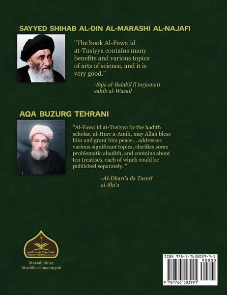 The author gathered in these issues what no other works have compiled. Whoever contemplates them will find in them subtle points, insights, rare findings, precise explanations, answers to doubts, clarification of ambiguities, removal of deceptions and fallacies, refutation of the well-known falsifications and distortions, and the invalidation of the falsehoods that have appeared in some of the books of the Imamiyyah scholars influenced by the embellished fabrications of the Ahl al-Sunnah. It also awakens the heedless to some of the widespread beliefs that contradict the recurrent narrations. This cannot be found in any other books. I ask the reader to correct any errors and to pardon any slips or mistakes. I have entitled it: Al-Fawäid at-Tusiya, and Allah is the ultimate guide to success.