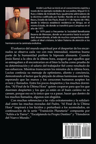 El esfuerzo del mundo espiritual por el despertar de los encarnados se observa cada vez con más intensidad, mientras buena parte de la humanidad prefiere la hipnosis alienante. Cuando Jesús llamó a la obra de la última hora, aseguró que aquellos que se entregaban a él encontrarían en el bien la lucha como prueba de su determinación y el salario del trabajador fiel como resultado de sus esfuerzos. Mientras transcurren los minutos de la última hora, Lucius continúa su mensaje de optimismo, aliento y conciencia, demostrando al lector que la pléyade de almas luminosas está lista, esperando que las manos y los corazones humanos acepten los avisos y llamados. Entre los pocos despiertos y los muchos dormidos, "Al Final de la Última Hora" quiere cooperar para que los que duermen despierten y los que ya están en el buen camino no se cansen, porque eso es lo único que va a pasar, hacer que dentro de los muchos llamados, algunos son elegidos. Con muchas referencias a las vida extraterrestre y la solidaridad entre las muchas moradas del Padre, "Al Final de la Última Hora" inspirará a los lúcidos y perturbará a los acomodados, en continuación de la serie "Transición Planetaria" compuesta por "Adiós a la Tierra", "Esculpiendo tu Propio Destino" y "Herederos del Nuevo Mundo".
