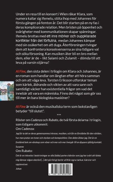 Under en resa till en konsert i Wien råkar Klara, som numera kallar sig Ifemelu, stöta ihop med Johannes för första gången på femton år. Det blir starten på en ny fas i deras komplicerade relation. Men bristen på öppenhet och svårigheter med kommunikationen skapar spänningar. Ifemelu brottas med ett inre mörker och ouppklarade konflikter från det förflutna, medan Johannes kämpar med sin osäkerhet om att duga. Återföreningen tvingar dem att konfrontera konsekvenserna av sina tidigare val och söka försoning. Kan musiken åter bli en bro mellan dem, eller är de - likt Salami och Zulamit - dömda till att leva på varsin stjärna? Al Fine, den sista delen i trilogin om Klara och Johannes, är en roman som handlar om längtan efter att höra samman och om att våga leva. Torsten Eriksson utforskar teman som kärlek, åldrande och vikten av att vara sann och samtidigt väcker han existentiella frågor om vad det innebär att vara en människa. Finns det något som gör oss till mer än bara biologiska maskiner? Al Fine är också den musikaliska term som bokstavligen betyder "till slutet". Läs mer om boken på författarens webbplats, där det också finns en länk till en Spotifylista med musiken i romanen: https://www.torsteneriksson.se/al-fine