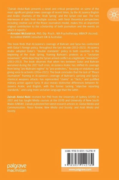 This book finds that Al-Jazeera's coverage of Bahrain and Syria has conformed with Qatar's foreign policy, throughout the last decade (2011-2021). Al-Jazeera Arabic adopted Qatar's "double standards" policy in both countries in the beginning of the Arab Spring, framing Bahrain's protests as a "sectarian movement," while depicting the Syrian armed conflict as a legitimate "revolution" (2011-2013). The book observes that when ties between Qatar and Bahrain worsened during the 2017 Gulf crisis, Al-Jazeera Arabic has shifted its coverage from being "pro-Bahraini regime" to "pro-protesters," focusing on violations and giving voice to activists (2014-2021). The book concludes that the lack of "Peace Journalism" framing in Al-Jazeera's coverage of Bahrain's uprising and Syria's chemical weapons attacks has represented "claims" as "facts," and justified military action against Syria. It also reveals distinctive differences between Al-Jazeera Arabic and English, with theformer lacking"objective reporting standards," and using more sectarian language than the latter.