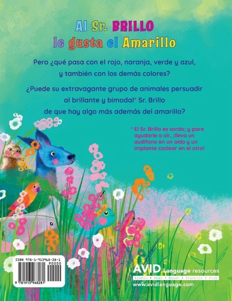 Al Sr. Brillo le gusta el amarillo... pero ¿qué pasa con el rojo, naranja, verde y azul, y también con los demás colores? ¿Puede su extravagante grupo de animales persuadir al brillante y bimodal* Sr. Brillo de que hay algo más además del amarillo? *El Sr. Brillo es sordo; y para ayudarle a oír, ¡lleva un audífono en un oído y un implante coclear en el otro! El Sr. Brillo es realmente un tipo genial, vestido de amarillo y listo para una espléndida aventura con su colorida tripulación de animales. Con cada vuelta de página, la historia aumenta, añadiendo cada vez un nuevo color, una nueva criatura, un nuevo giro a la historia... ¡y culminando en una fiesta a todo color! Se trata de un libro infantil inclusivo protagonizado por un personaje que resulta ser sordo, pero que no trata específicamente de la pérdida de audición. Al Sr. Brillo le gusta el amarillo es un cuento exuberante sobre un tipo divertido y extravagante (que tiene una blanca cometa que vuela en una noche concreta, mientras se balancea en su cama roja escarlata) y sus fantásticos amigos animales. El libro hará que los niños se rían mientras recitan sus rimas, a medida que avanzan de página en página. El libro permite a los niños que utilizan tecnología de asistencia auditiva verse representados (a través del fabuloso Sr. Brillo) y muestra a todo el mundo, tengan o no pérdida auditiva, que llevar audífonos y/o implantes cocleares es realmente genial. Para aquellos padres y terapeutas que deseen utilizarlo como recurso para el desarrollo del habla y el lenguaje, el libro integra estrategias de escucha y lenguaje hablado (LSL), que la autora empleó cuando enseñó a su propia hija (con sordera profunda y ayudada por implantes cocleares) a escuchar y hablar. Estas estrategias incluyen: La audición antes que la visión: Los nuevos personajes y nuevos colores se describen con palabras en la página anterior de cuando los veamos realmente, lo que permite al cerebro del niño procesar la información auditiva antes de la información visual. Hablar por adelantado - ¿qué viene después? A medida que el libro presenta nuevos colores y nuevos personajes uno por uno, el lector y el niño pueden divertirse mucho adivinando y discutiendo qué color y qué personaje podría revelarse a continuación. Practicar el cierre auditivo: Estructurado como un poema que se repite y construye al pasar las páginas, el libro ofrece múltiples oportunidades para practicar el cierre auditivo (cuando el lector hace una pausa y permite al niño completar la siguiente palabra o frase). Refuerzo de la memoria auditiva: Los niños querrán unirse de forma natural a la recitación del poema a medida que se repite y aumenta a lo largo del libro. Ampliación del vocabulario Desarrollar la inteligencia emocional y la teoría de la mente [Available in English as 'Mr Mellow Likes Yellow']