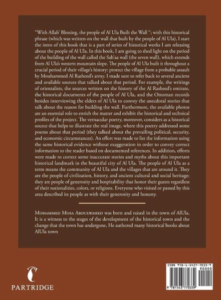 "With Allah' Blessing, the people of Al Ula Built the Wall "; with this historical phrase (which was written on the wall that built by the people of Al Ula), I start the intro of this book that is a part of series of historical works I am releasing about the people of Al Ula. In this book, I am going to shed light on the period of the building of the wall called the Sab'aa wall (the seven wall), which extends from Al Ula's western mountain slope. The people of Al Ula built it throughout a crucial period of their village's history: protect the village from a probable assault by Mouhammed Al Rasheed's army. I made sure to refer back to several ancient and available sources that talked about that period. For example, the writings of orientalists, the sources written on the history of the Al Rasheed's emirate, the historical documents of the people of Al Ula, and the Ottoman records besides interviewing the elders of Al Ula to convey the anecdotal stories that talk about the reason for building the wall. Furthermore, the available photos are an essential role to enrich the matter and exhibit the historical and technical profiles of the project. The vernacular poetry, moreover, considers as a historical source that helps to illustrate the real image, where this poetry addressed some poems about that period (they talked about the prevailing political, security, and economic circumstances). An effort was made to list the information using the same historical evidence without exaggeration in order to convey correct information to the reader based on documented references. In addition, efforts were made to correct some inaccurate stories and myths about this important historical landmark in the beautiful city of Al Ula. The people of Al Ula as a term means the community of Al Ula and the villages that are around it. They are the people of civilization, history, and ancient cultural and social heritage; they are people of generosity and hospitability that honor their guests regardless of their nationalities, colors, or religions. Everyone who visited or passed by this area described its people as with their generosity and honesty.