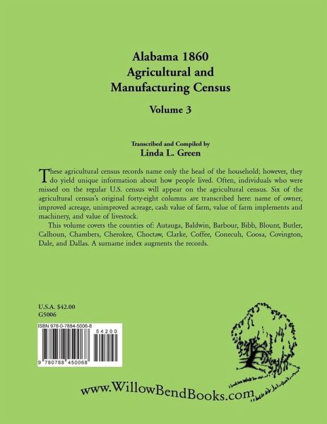 These agricultural census records name only the head of the household; however, they do yield unique information about how people lived. Often, individuals who were missed on the regular U.S. census will appear on the agricultural census. Six of the agricultural census's original forty-eight columns are transcribed here: name of owner, improved acreage, unimproved acreage, cash value of farm, value of farm implements and machinery, and value of livestock. This volume covers the counties of: Autauga, Baldwin, Barbour, Bibb, Blount, Butler, Calhoun, Chambers, Cherokee, Choctaw, Clarke, Coffee, Conecuh, Coosa, Covington, Dale, and Dallas. A surname index augments the records.