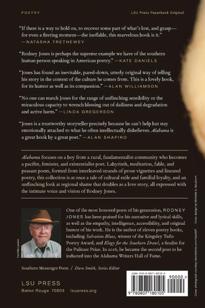 Alabama focuses on a boy from a rural, fundamentalist community who becomes a pacifist, feminist, and existentialist poet. Labyrinth, meditation, fable, and peasant poem, formed from interleaved strands of prose vignettes and lineated poetry, this collection is at once a tale of cultural exile and familial loyalty, and an unflinching look at regional shame that doubles as a love story, all expressed with the intimate voice and vision of Rodney Jones.