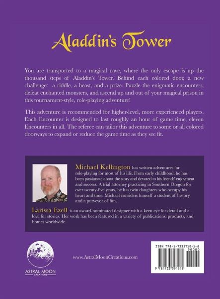 You are transported to a magical cave, where the only escape is up the thousand steps of Aladdin's Tower. Behind each colored door, a new challenge: a riddle, a beast, and a prize. Puzzle the enigmatic encounters, defeat enchanted monsters, and ascend up and out of your magical prison in this tournament-style, role-playing adventure! This adventure is recommended for higher-level, more experienced players. Each Encounter is designed to last roughly and hour of game time, eleven Encounters in all. The referee can tailor his adventure to some or all colored doorways to expand or reduce the game time as they see fit.