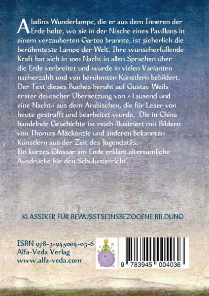 Aladins Wunderlampe, die er aus dem Inneren der Erde holte, wo sie in der Nische eines Pavillons in einem verzauberten Garten brannte, ist sicherlich die berühmteste Lampe der Welt. Ihre wunscherfüllende Kraft hat sich in 1001 Nacht in allen Sprachen über die Erde verbreitet und wurde in vielen Varianten nacherzählt und von berühmten Künstlern bebildert. Der Text dieses Buches beruht auf Gustav Weils erster deutscher Obersetzung von »Tausend und eine Nacht« aus dem Arabischen, die für Leser von heute gestrafft und bearbeitet wurde. Die in China handelnde Geschichte ist reich illustriert mit Bildern von Thomas Mackenzie und anderen bekannten Küünstlern aus der Zeit des Jugendstils. Ein kurzes Glossar am Ende erklärt altertümliche Ausdrücke für den Schulunterricht.