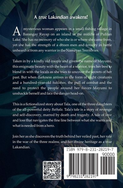 A true Lakandian awakens... A mysterious woman appears in a small fishing village in Barangay Rayap on an island in the middle of Pulilan Lake. She has no memory of who she is or where she came from, yet she has the strength of a dozen men and ferocity in battle unheard of from any warrior in the Namayan Territories. Taken in by a kindly old couple and given the name of Mayumi, this enigmatic beauty with the heart of a warrior, tries her best to blend in with the locals as she tries to uncover the secrets of her past. But when darkness arrives in the form of night creatures and a hundred-year-old hukloban, the pull of combat and the need to protect the people around her forces Mayumi to unshackle herself and face the danger head-on. This is a fictionalized story about Tala, one of the three daughters of the all-powerful deity Bathala. Tala's tale is a story of revenge and self-discovery, marred by death and tragedy. A tale of love and loss that navigates the fine line between what she wants and what is needed from a hero. Join her as she discovers the truth behind her veiled past, her role in the war of the three realms, and her divine heritage as a true Lakandian.