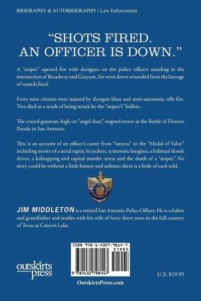 "Shots fired. An officer is down." A "sniper" opened fire with shotguns on the police officers standing in the intersection of Broadway and Grayson. Six went down wounded from the barrage of rounds fired. Forty nine citizens were injured by shotgun blast and semi-automatic rifle fire. Two died as a result of being struck by the "sniper's bullets. The crazed gunman, high on "angel dust," reigned terror at the Battle of Flowers Parade in San Antonio. This is an account of an officer's career from "tattoos" to retirement including stories of a serial rapist, hi-jackers, systematic burglars, a habitual drunk driver, a capital murder arrest and the death of a "sniper." No story could be without a little humor and sadness; there is a little of each told. "What I wanted to do was tell him to go hit in the head with a bottle, fight with three individuals, make entry into a dark house, see a deceased person on the floor, threatened to be killed, ride to the hospital in an ambulance and receive medical treatment and see if he could piece together the time." "The early morning hour, the description, the peering into a window of a duplex and then his checking to see if we were watching him, left us with no doubt we had a viable suspect." "The burglar stopped and produced a pistol, a four inch barrel .38 special, in his right hand and was rotating in a clockwise movement to face off with two armed police officers." "'I'm a really good thief' and in fact said, 'I'm so smart you can't catch me!'" "'We heard you were making under cover narcotic buys and we wanted to get a good close look at you!' He further stated, 'I don't care for people who stick their nose into other people's business and that there should be less of people like you around.'" "I could not bring myself to tell him how to be a better 'hi-jacker.'" "The Lord had to have been with someone that day or perhaps