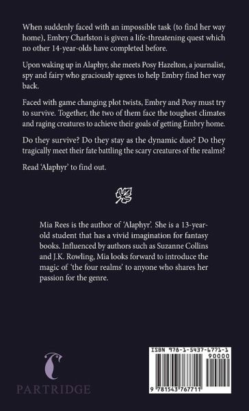 When suddenly faced with an impossible task (to find her way home), Embry Charlston is given a life-threatening quest which no other 14-year-olds have completed before. Upon waking up in Alaphyr, she meets Posy Hazelton, a journalist, spy and fairy who graciously agrees to help Embry find her way back. Faced with game changing plot twists, Embry and Posy must try to survive. Together, the two of them face the toughest climates and raging creatures to achieve their goals of getting Embry home. Do they survive? Do they stay as the dynamic duo? Do they tragically meet their fate battling the scary creatures of the realms? Read 'Alaphyr' to find out.