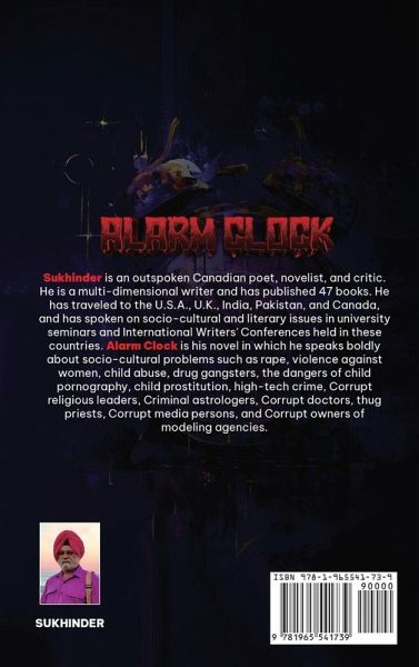 Sukhinder is an outspoken Canadian poet, novelist, and critic. He is a multi-dimensional writer and has published 47 books. He has traveled to the U.S.A., U.K., India, Pakistan, and Canada, and has spoken on socio-cultural and literary issues in university seminars and International Writers' Conferences held in these countries. Alarm Clock is his novel in which he speaks boldly about socio-cultural problems such as rape, violence against women, child abuse, drug gangsters, the dangers of child pornography, child prostitution, high-tech crime, Corrupt religious leaders, Criminal astrologers, Corrupt doctors, thug priests, Corrupt media persons, and Corrupt owners of modeling agencies.