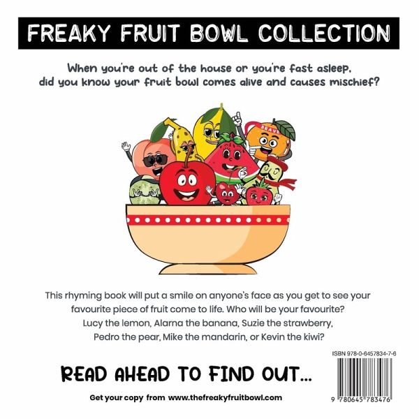 Alarna the Banana is growing brown spots! As bananas age they can grow brown spots, but her freaky fruit friends are not sure if they should tell her about her new spots or not. Some fruit has spots and some does not, We should not care who is spotty or not. Read this fun-loving and suspenseful book that will spark anyone's imagination and make fruit come to life before your eyes. Collection One of the Freaky Fruit Bowl Collection is Suzie the Strawberry, Alarna the Banana, Pedro the Pear, Lucy the Lemon, and Kevin the Kiwi. These books make everyone smile and the clever characters will spark the imaginations of anyone who reads them. Your trip to the grocery shop will never be the same again, you will see the characters whenever you see the fresh fruit section and imagine the fun they get up to when no humans are around.