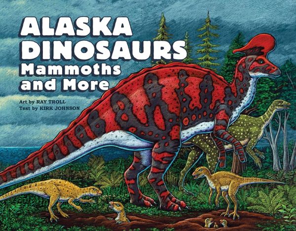 Explore the world of fascinating prehistoric creatures that once roamed ancient Alaska. Packed with vibrant illustrations of dinosaurs by artist Ray Troll and lively text by paleontologist Kirk Johnson, this dynamic picture book is perfect for curious kids ages 8-12 and dinophiles of all ages. This engaging richly illustrated picture book is the perfect introduction to Alaska’s dinosaurs. It opens with an irresistible, jam-packed map of Alaska fossils, and then proceeds through a timeline of prehistoric creatures that inhabited ancient Alaska’s oceans and forests. Discover thalattosaurs, giant sea lizards who lived over 200 million years ago, and the mysterious “desmos,” a prehistoric marine mammal that looked like a hippo but might be related to horses and rhinos and roamed the region 20 million years ago, and many more!