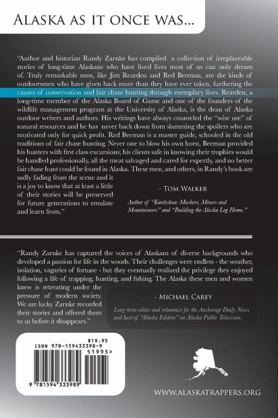 Author and historian Randy Zarnke has compiled a collection of irreplaceable stories of long-time Alaskans who have lived lives most of us can only dream of. Truly remarkable men, like Jim Rearden and Red Beeman, are the kinds of outdoorsmen who have given back more than they have ever taken, furthering the causes of conservation and fair chase hunting through exemplary lives. Rearden, a long-time member of the Alaska Board of Game and one of the founders of the wildlife management program at the University of Alaska, is the dean of Alaska outdoor writers and authors. His writings have always counseled the "wise use" of natural resources and he has never back down from slamming the spoilers who are motivated only for quick profit. Red Beeman is a master guide, schooled in the old traditions of fair chase hunting. Never one to blow his own horn, Beeman provided his hunters with first class excursions; his clients safe in knowing their trophies would be handled professionally, all the meat salvaged and cared for expertly, and no better fair chase hunt could be found in Alaska. These men, and others, in Randy's book are sadly fading from the scene and it is a joy to know that at least a little of their stories will be preserved for future generations to emulate and learn from."