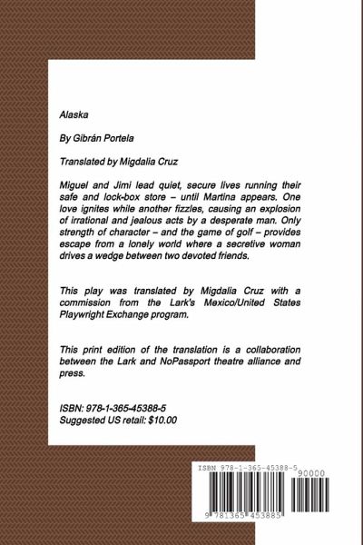 ALASKA by Gibrán Portela. Translated from the Spanish by Migdalia Cruz. In ALASKA, Miguel and Jimi lead quiet, secure lives running their safe and lock-box store - until Martina appears. One love ignites while another fizzles, causing an explosion of irrational and jealous acts by a desperate man. Only strength of character - and the game of golf - provides escape from a lonely world where a secretive woman drives a wedge between two devoted friends. This publication is a collaboration between Lark Play Development Center and NoPassport Press.