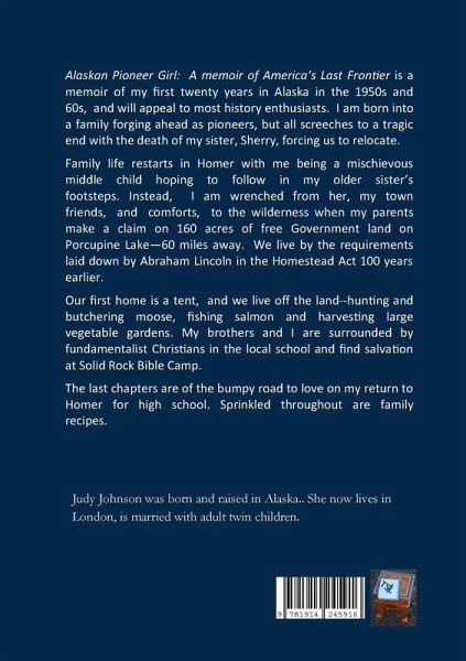 Alaskan Pioneer Girl:A memoir of America's Last Frontier is a memoir of my first twenty years in Alaska in the 1950s and 60s,and will appeal to most history enthusiasts.I am born into a family forging ahead as pioneers, but all screeches to a tragic end with the death of my sister, Sherry, forcing us to relocate. Family life restarts in Homer with me being a mischievous middle child hoping to follow in my older sister's footsteps.Instead,I am wrenched from her, my town friends,andcomforts,to the wilderness when my parents make a claim on 160 acres of free Government land on Porcupine Lake-60 miles away.We live by the requirements laid down by Abraham Lincoln in the Homestead Act 100 years earlier. Our first home is a tent,and we live off the land--hunting and butchering moose, fishing salmon and harvesting large vegetable gardens.My brothers and I are surrounded by fundamentalist Christians in the local school and find salvation at Solid Rock Bible Camp. The last chapters are of the bumpy road to love on my return to Homer for high school.Sprinkled throughout are family recipes.