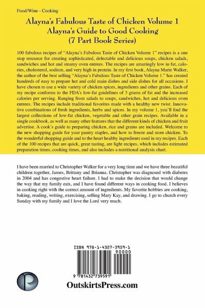 Alayna's Fabulous Taste of Chicken Volume 1 Alayna's Guide to Good Cooking (7 Part Book Series) 1" recipes is a one stop resource for creating sophisticated, delectable and delicious soups, chicken salads, sandwiches and hot and steamy oven entrees. The recipes are amazingly low in fat, calories, cholesterol, sodium, and very high in protein. In my first book, Alayna Marie Walker, the author of the best selling "Alayna's Fabulous Taste of Chicken Volume 1." has created hundreds of easy to prepare hot and cold main dishes and side dishes for all occasions. I have chosen to use a wide variety of chicken spices, ingredients and other grains. Each of my recipe conforms to the FDA's low-fat guidelines of 3 grams of fat and the increased calories per serving. Ranging from salads to soups, sandwiches, hot and delicious oven entrees. The recipes include traditional favorites made with a healthy new twist. Innovative combinations of fresh ingredients, herbs and spices. In my volume 1, you'll find the largest collections of low-fat chicken, vegetable and other grain recipes. Available in a single cookbook, as well as many other features that the different kinds of chicken and fruit advertise. A cook's guide to preparing chicken, rice and grains are included. Welcome to the new shopping guide for your pantry staples, and how to freeze and store chicken. To the wonderful shopping guide and to the heart healthy ingredients used in my recipes. Each of the 100 recipes that are quick, great tasting, are light recipes, which includes estimated preparation times, cooking times, and also includes a nutritional analysis chart.
