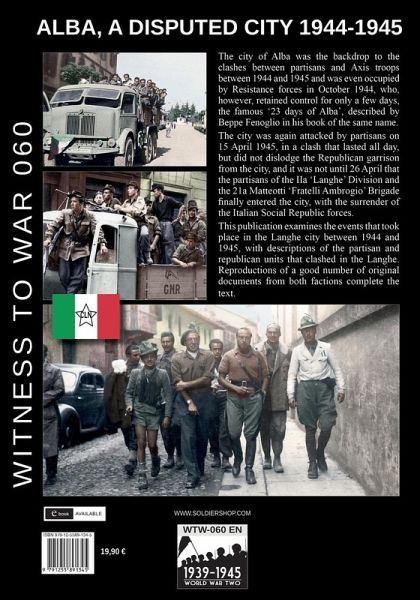 The town of Alba was the backdrop to the clashes between partisans and Axis troops between 1944 and 1945 and was even occupied by Resistance forces in October 1944, who, however, only maintained control for a few days, the famous '23 days of Alba', described by Beppe Fenoglio in his book of the same name. The town was again attacked by partisans on 15 April 1945, in a clash that lasted all day, but did not dislodge the republican garrison from the town, and it was not until 26 April that the partisans of the 2nd 'Langhe' Division and the 21st Matteotti 'Fratelli Ambrogio' Brigade finally entered the town, with the surrender of the forces of the Italian Social Republic. This publication examines the events that took place in the Langhe town between 1944 and 1945, with descriptions of the partisan and republican units that clashed in the Langhe.